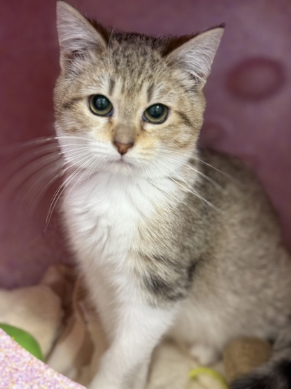 Imagine this beautiful little kitten in your home-trotting over to greet you, happily batting at her toys, scratching away on her favorite cardboard pads, and then settling in close for affection. At just four months old, she's friendly, gentle, and loves being near her people. She has a soft, loving nature and enjoys both playful moments and cozy, quiet time.