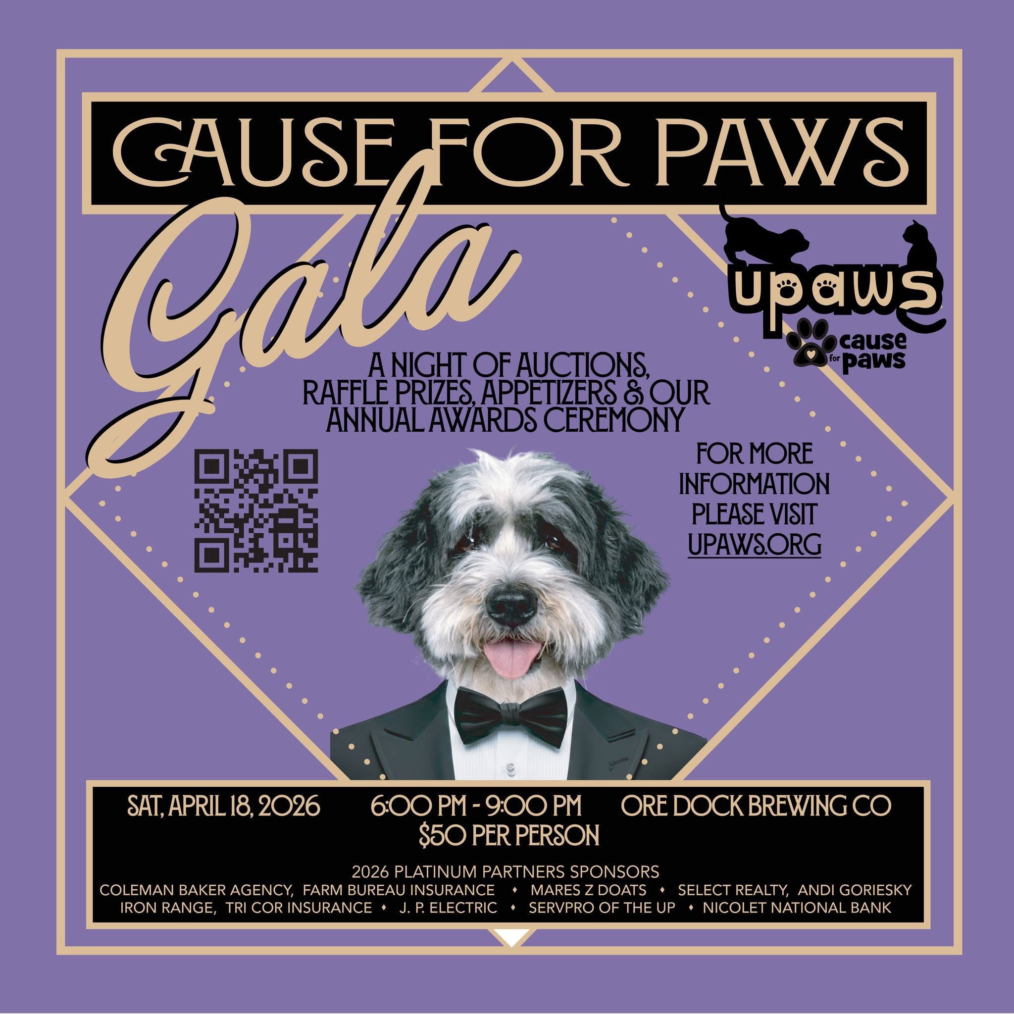 Marquette, MI — UPAWS will host its annual Cause for Paws Gala on Saturday, April 18, 2026, from 6:00 PM to 9:00 PM at Ore Dock Brewing Company. The evening promises to be a memorable celebration supporting local animal welfare efforts, featuring a live auction, raffles, great local appetizers, music, and the organization’s annual awards ceremony. EVENT TICKETS FOUND HERE
