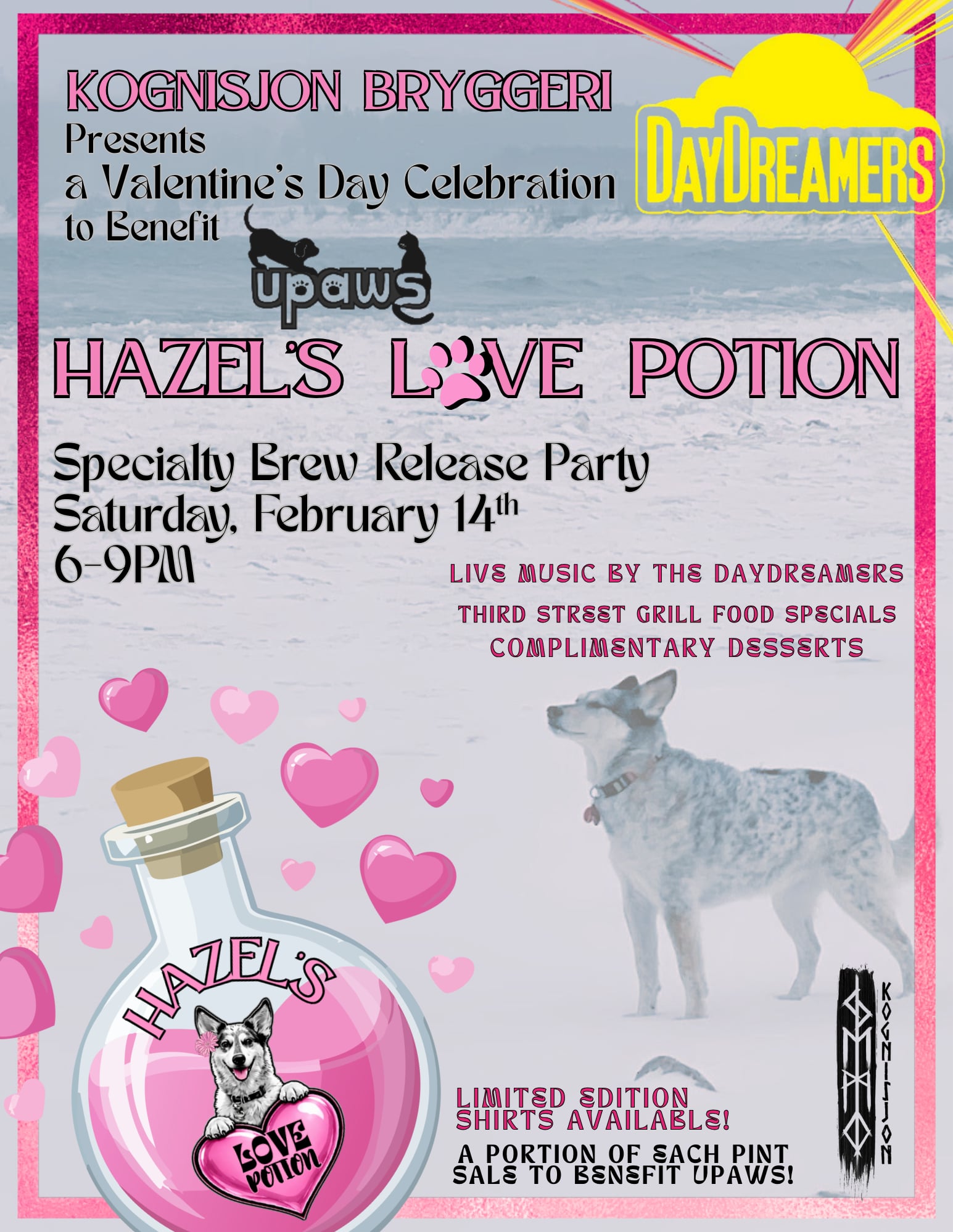 Hazel is teaming up with Kognisjon to celebrate Valentine’s Day in a big way! Hazel uses her cattle dog instincts regularly as the official mascot of the Frost Coast Plunge Posse- a group of cold water immersion enthusiasts who plunge nearly every day of the year in Lake Superior. She greets each person at the beach prior to entering the water and again as they exit. On February 14th, she is looking to utilize her herding instincts to bring beer enthusiasts together to spread the love this Valentine’s Day. Join us for the release of “Hazel’s Love Potion,” a chocolate stout brewed by Kognisjon Bryggeri to benefit UPAWS! Enjoy a night out with your gal pals and buddies, or a date night to celebrate Valentine’s Day. We’ll have live music by the Daydreamers, complimentary desserts to pair with your pint of “Hazel’s Love Potion,” and food specials at the Third Street Grill available.