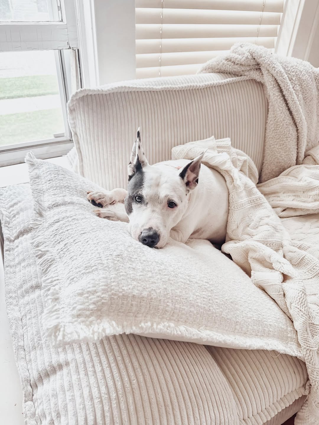 “Sprinkles is doing GREAT! I think she’s settling in well here. We all adore her – even my husband, who typically couldn’t care less – and she is great with the kids. So far, she’s being spoiled with attention and loves her walks around the neighborhood. We got her a new bed, which she loves, but she definitely prefers the couch [Photo attached] where she can be a nosy butt watching the neighborhood business from the window.